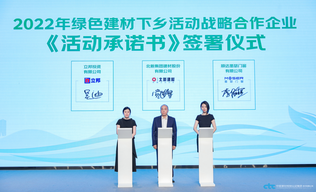 會上還發(fā)布了首批2022年綠色建材下鄉(xiāng)活動產(chǎn)品清單及企業(yè)名錄,正式啟動了綠色建材下鄉(xiāng)活動公共信息發(fā)布平臺及京東線上平臺,并對下一步工作進(jìn)行了總體安排。國檢集團(tuán)綠色建材產(chǎn)品認(rèn)證客戶北新集團(tuán)建材股份有限公司、立邦投資有限公司、順達(dá)墨瑟門窗有限公司的代表共同簽署了活動參與承諾書,承諾確保參加活動的產(chǎn)品及服務(wù)質(zhì)量,積極配合開展綠色建材下鄉(xiāng)活動,充分發(fā)揮引領(lǐng)示范作用。